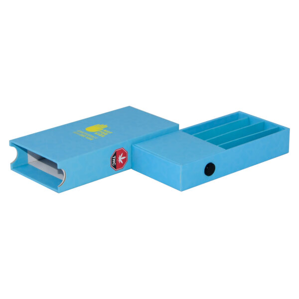 Ensure safety and style with this custom child resistant paper drawer box for pre-rolls. Features a secure CR button mechanism, a vibrant blue design, and inner dividers to hold multiple units. Fully brandable for compliant cannabis packaging.